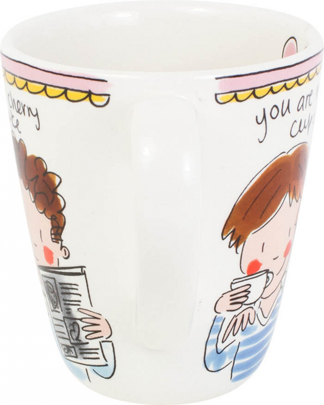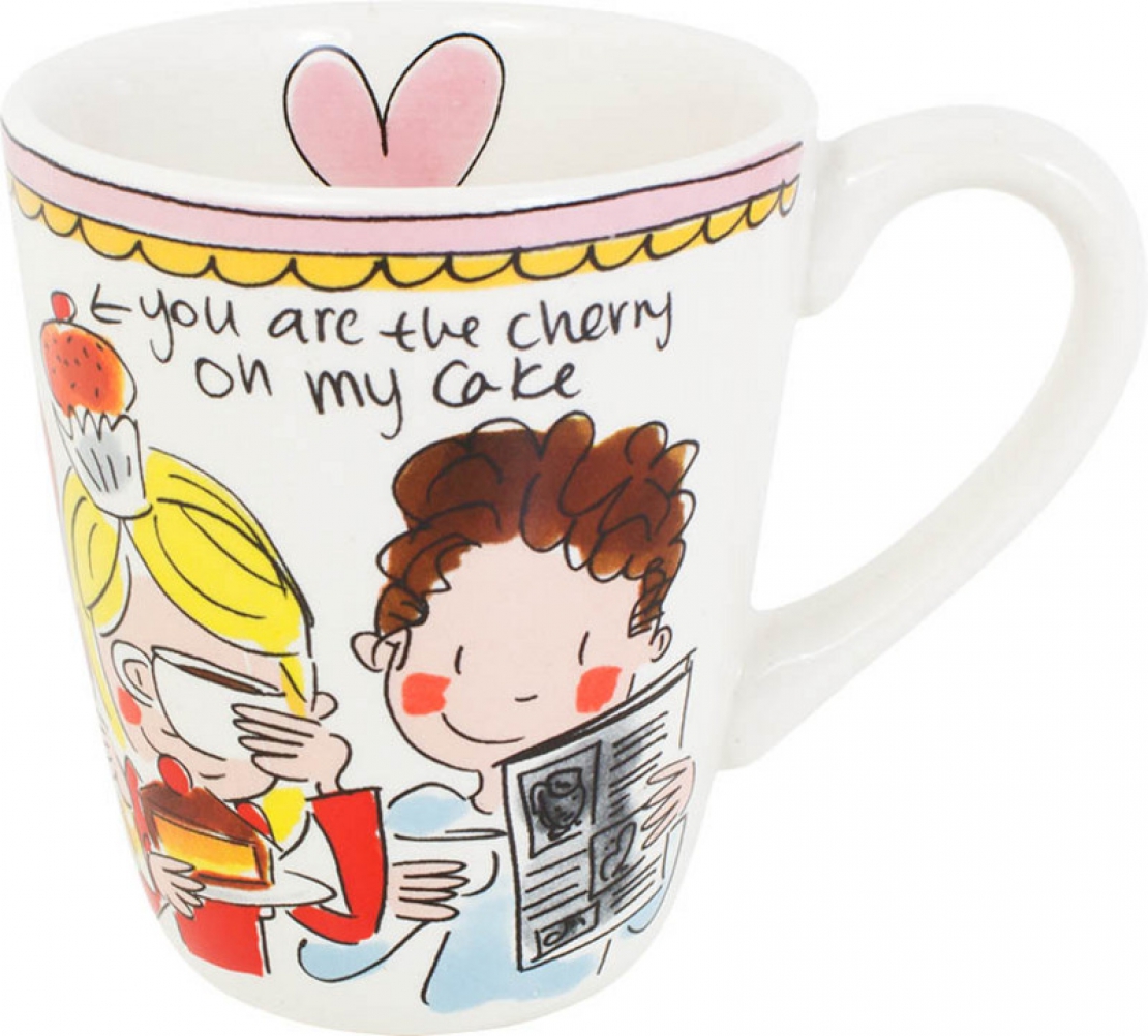De nieuwe frisse mok heeft vrolijke illustraties en een roze bovenrand.