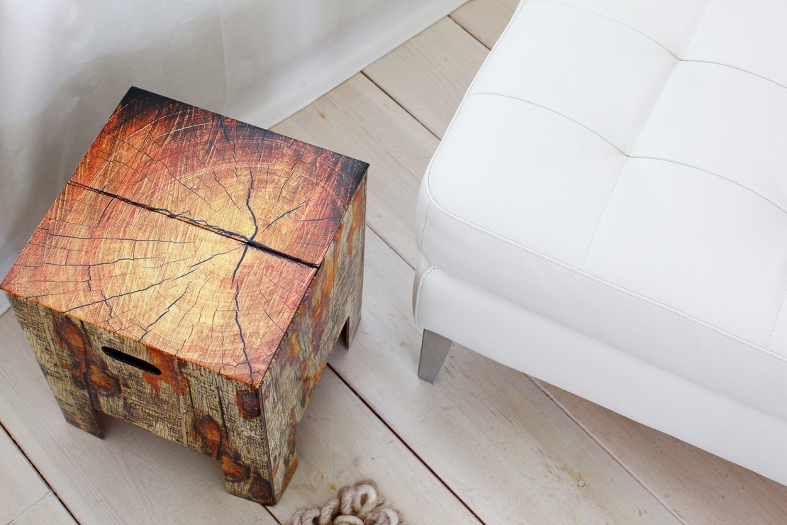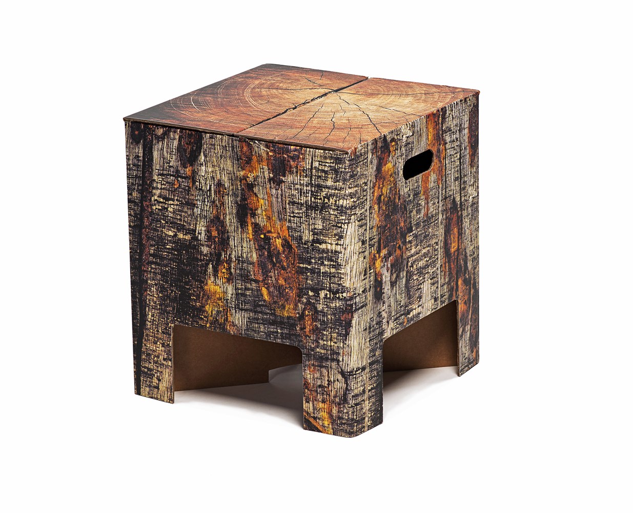 Deze kartonnen kruk, de Tree Trunk is bijna zo stevig als een echte uit het bos, het is dat ie vierkant is anders zou je hem niet herkennen als kartonnen kruk. Als je erop gaat zitten voelt deze kruk ook echt alsof hij van hout is, moeilijk voor te stellen dat het gaat om karton.